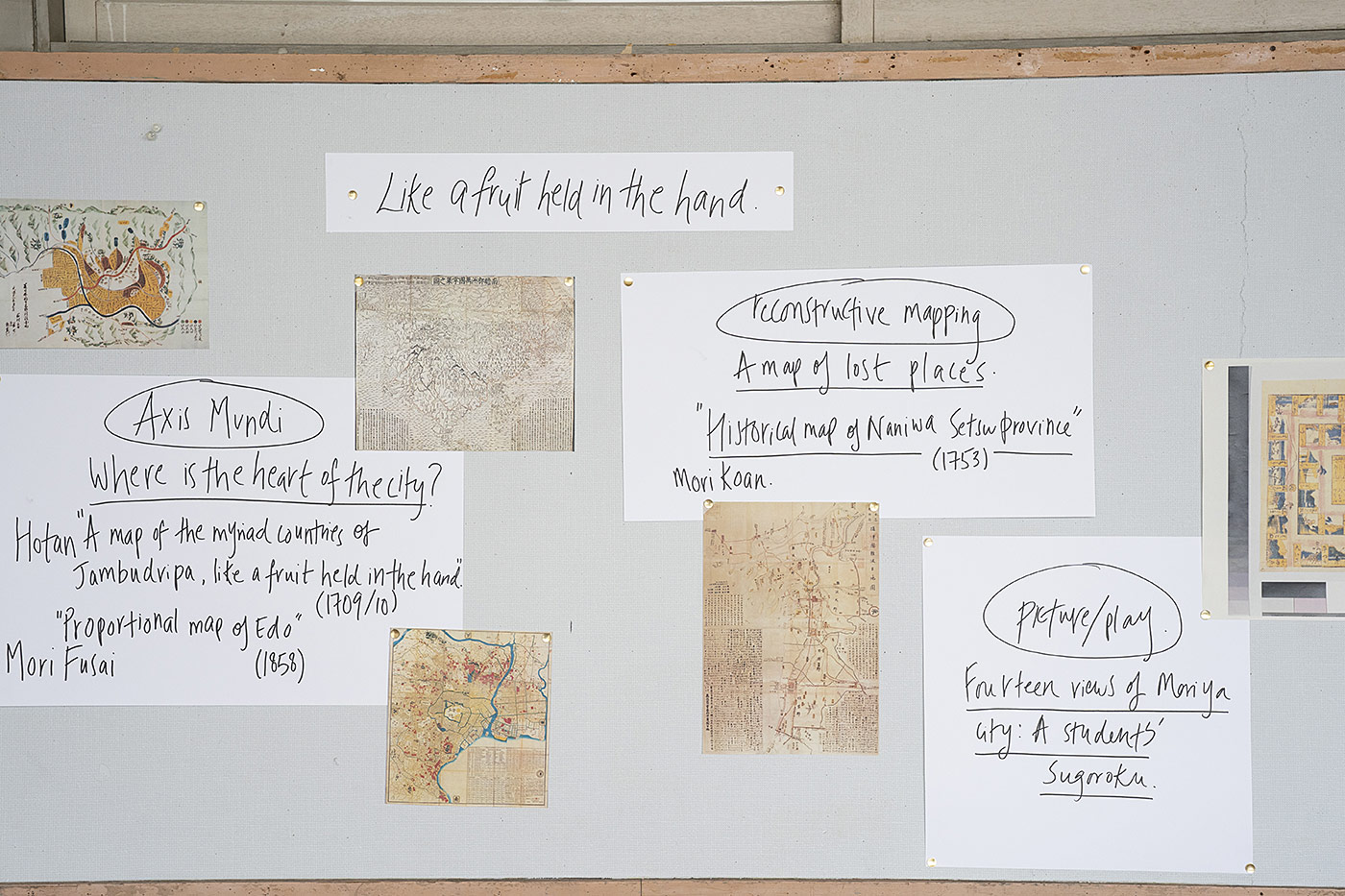 Like a fruit held in the hand is a critical and creative engagement with Japanese cartographic traditions. The project takes its name from a world map produced by the buddhist monk Hotan in 1709. Titled “A Map of the Myriad Countries of Jambudvipa Like a Fruit Held in the Hand” Hotan’s work represented a distinctive, cosmologically grounded approach to cartography. The phrase “fruit held in the hand” refers to something that is plain to see and comprehend, emphasising the power of Buddhist insight. It suggests that the clearest way to see the land may be through perspectives that are often disregarded today: spiritual, personal, located.