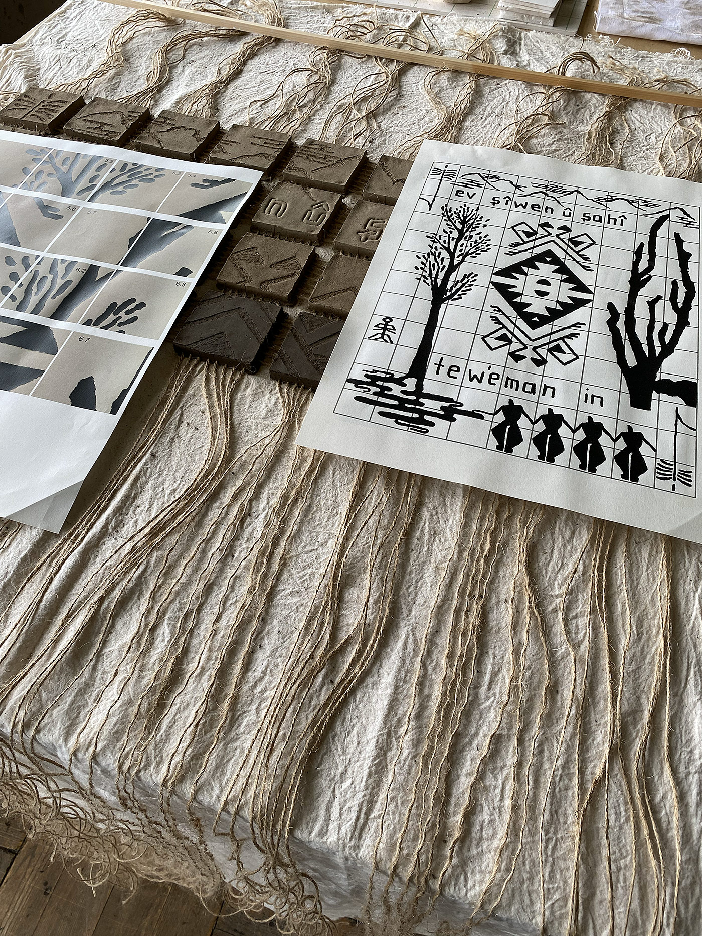 In continuing my practice of working with earth, I am currently sculpting a carpet made from woven jute and tiles made from local earth. The tiles are carved with patterns and symbols representative of my own memory as well as collective memory from Qele and Moriya.