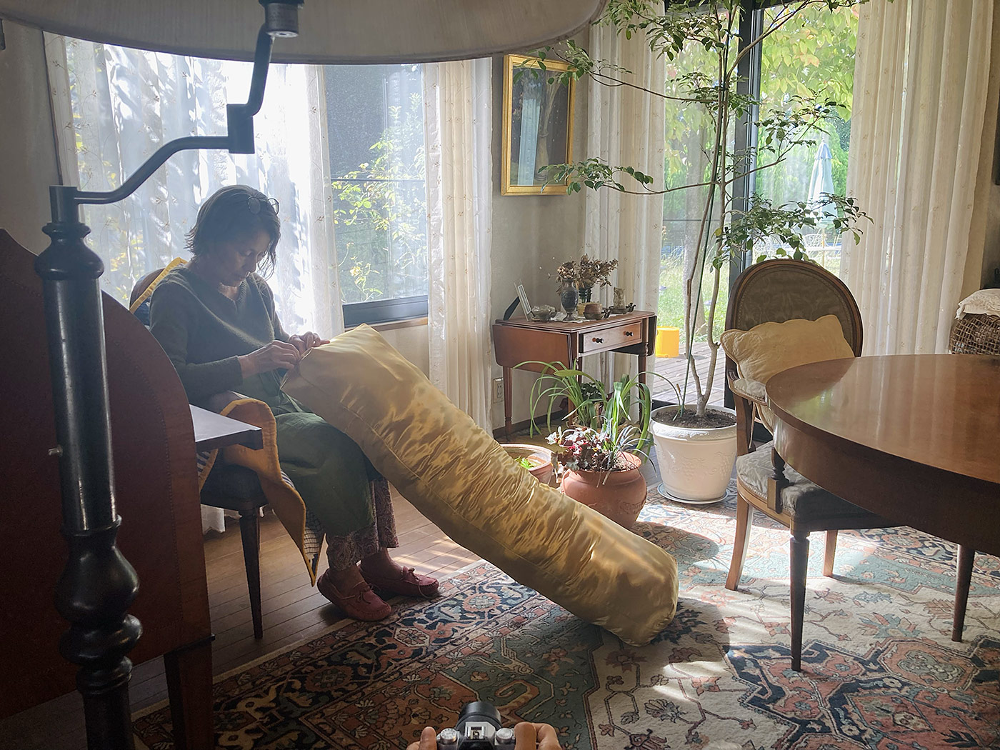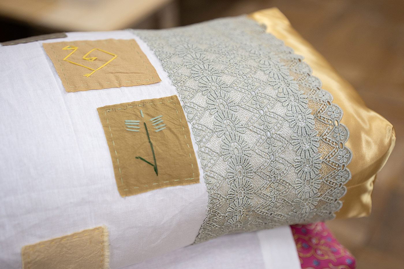 These learning experiences have resulted in a project in which I started working with women living in Moriya who have generously shared their time and experience, as well as materials from their personal and family histories. Together, we are working on a piece inspired by my childhood pillows, whose covers were adorned with embroidered patterns. The textiles we are using come with their own stories and become a part of mine, creating a fluid, collective memory.