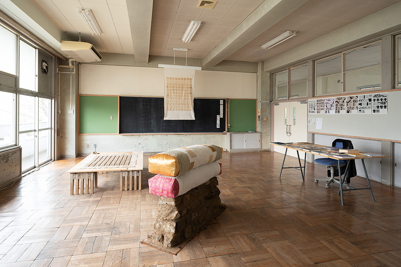 At ARCUS, he sought out traditional Kurdish patterns, creating both sculptural and video works that imagine the overlapping points of connection between Kurdish and Japanese cultures. In the context of a society where attitudes towards immigrants are subtly shifting, and considering the limited 90-day residence period, ARCUS staff initially researched the Kurdish community in Japan, identifying people Kurt should meet. However, such concerns proved unnecessary. While we were still going over our considerations, Kurt had already gone out on his own into the local areas, building relationships by visiting carpet stores or restaurants run by members of the Kurdish community. In parallel, he collected fabrics holding particular memories from residents of Moriya and embroidered these, using the opportunity to engage in dialogue about textiles, such as the pillow covers of his childhood. He additionally created a carpet featuring Kurdish patterns using jute and soil of Moriya and his homeland. The jute, fabric and earth are all gifts from places where the artist has lived either in the past or present.